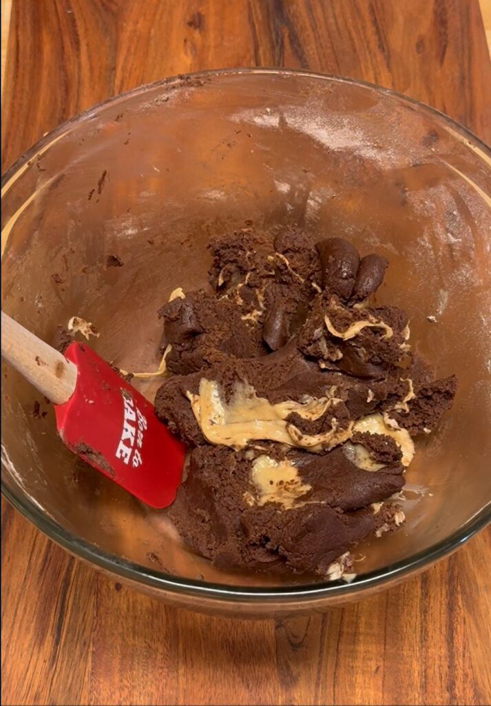 • Drop dollops of the sweetened condensed milk mixture into the cookie dough. Gently fold in the condensed milk mixture but try not to over mix. You want to create visible swirls.