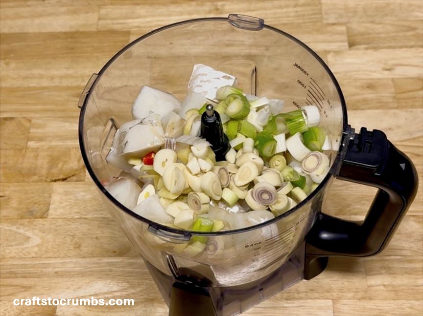 • Using a mortar and pestle pound lemongrass, garlic, white parts of the scallions, ginger, chilis (if using), and ¼ teaspoon of the salt. Pound until you get a paste.