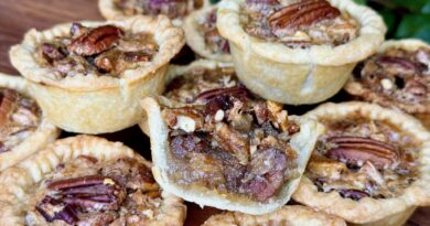 Storage – best if eaten the same day, but may be stored in airtight container, at room temperature for 3-4 days. They can be frozen for up to 3 months. Wrap tightly and place in a freezer safe bag. Let thaw unwrapped on the counter for an hour to two or until a knife inserted into the center of the pie without resistance. Just like my mini pecan pies, after they have thawed, bake at 325℉ for 5-7 minutes. 10 minutes max. I usually just plop them back into the same muffin pan that they were originally baked in. This helps to kind of awaken the pie again and reduce some of the moisture that comes with freezing.