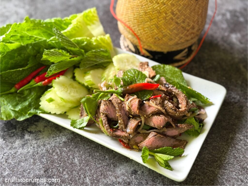 • Accompaniments – the salad is usually served with sticky rice, mints, and lettuce or sometimes even cabbage. If you are on a lower carb restriction, you can skip the sticky rice and enjoy the salad with vegetables or even as a lettuce wrap.