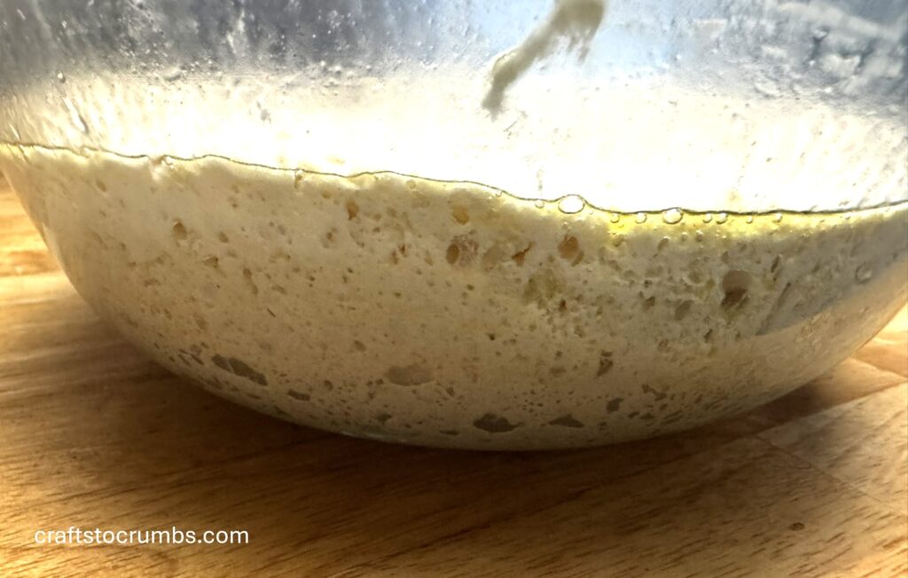 • Place in a warm spot in the kitchen and let the dough rise for about an hour to an hour and a half. **Proofing time varies due to different conditions. Proof until you see air bubbles in the dough. This may take 2-3 hours for a dough without sugar.**