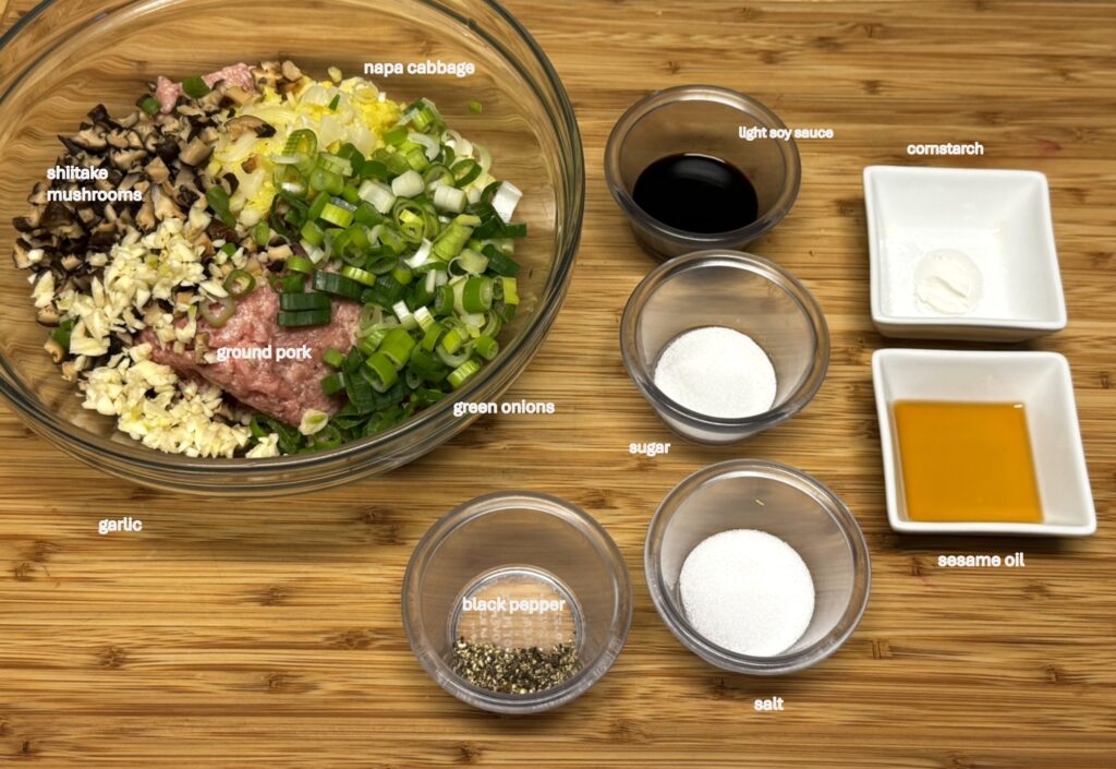 - To make the filling, combine pork, 1 cup of chopped cabbage, scallions, garlic, light soy sauce, salt, ground black pepper, sesame oil, and cornstarch. Mix well.