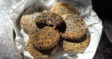 Heat up oil in a heavy pan until it reaches 325F. Fry 5 to 6 sesame balls at a time. Make sure to turn the balls when they are still on the bottom of the pan, so they don’t get over cooked on one side. Turn the sesame balls as needed when they float to the top, as thicker sides tend to roll under the oil, while thinner sides will be above the oil, which could lead to uneven cooking and browning. Fry for 6-8 minutes until balls are golden brown. Serve warm.