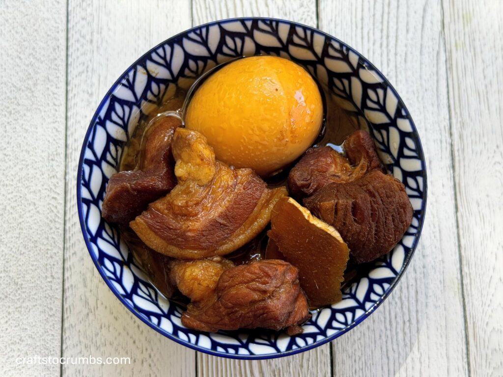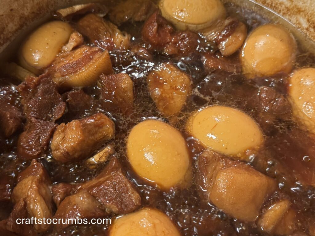 3) Reduce the heat to low and let it simmer for 1 hour to 1 ½ hour or until pork is tender, but not falling apart. Add the eggs about 15 minutes before the end of the cook time. Add more water if needed, do not let the water dry out. You can taste it at about the hour mark and adjust seasoning to your liking.